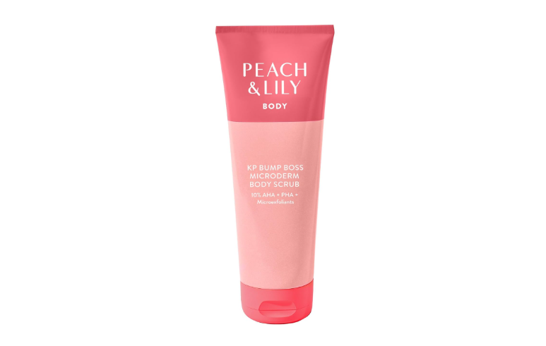 The Peach & Lily KP Bump Boss Microderm Body Scrub is a hybrid exfoliator that combines 10% AHAs, PHAs, and fine micro-crystals to smooth rough skin, keratosis pilaris, and ingrown-prone areas.